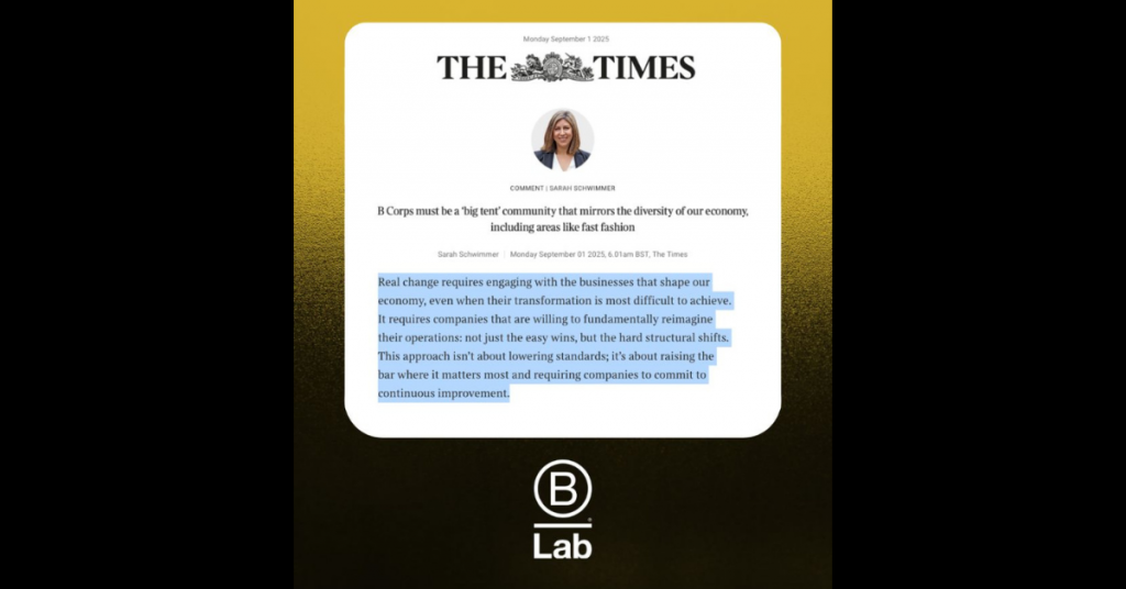 In a recent Times piece, B Lab Co-Lead Executive Sarah Schwimmer highlighted the movement’s rapid growth and made the case that certifying larger, complex companies is critical for systemic change. With tougher new standards on climate, workers, and supply chains, she emphasized that transformation must happen within high-impact industries. The takeaway was clear: real reform requires big players to commit, proving businesses can serve people and planet, not just profit