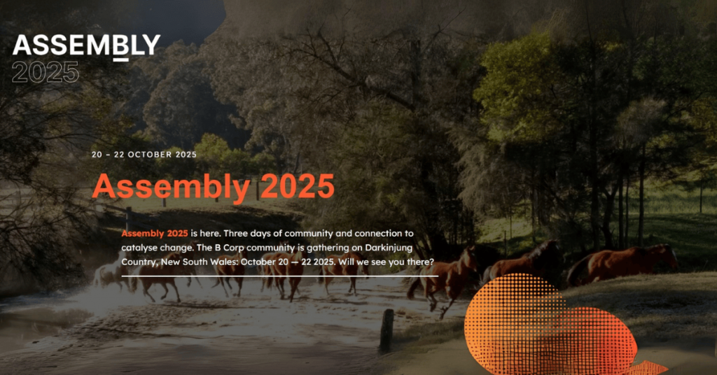 From 20-22 October, B Lab Australia & Aotearoa New Zealand will host Assembly 2025, a three-day B Corp community gathering in Darkinjung Country, NSW. Focused on climate, systems, and connection, the event is designed to spark bold ideas, foster honest conversations and inspire collective action. Learn more and register for Assembly 2025.